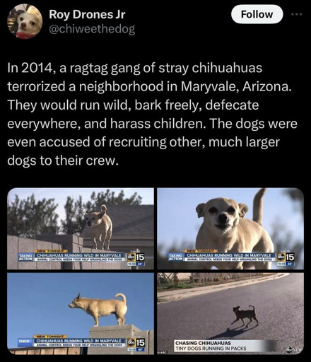 ickplant@lemmy.world to Lemmy Shitpost@lemmy.world · 1 month agoChihuahua ganglemmy.worldimagemessage-square8fedilinkarrow-up1296arrow-down12