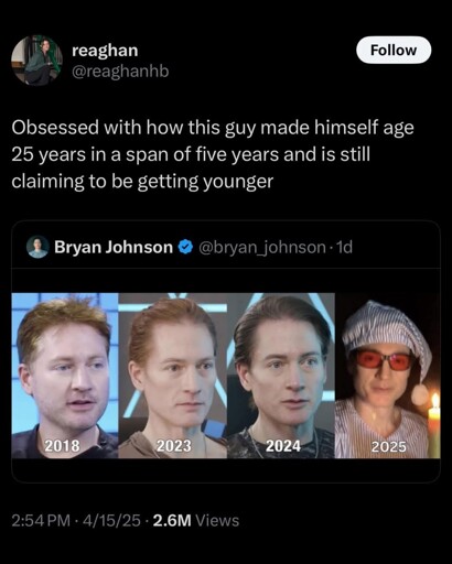 Surprisingly the person being quote-posted is the subject. It’s this weirdo: https://en.wikipedia.org/wiki/Bryan_Johnson