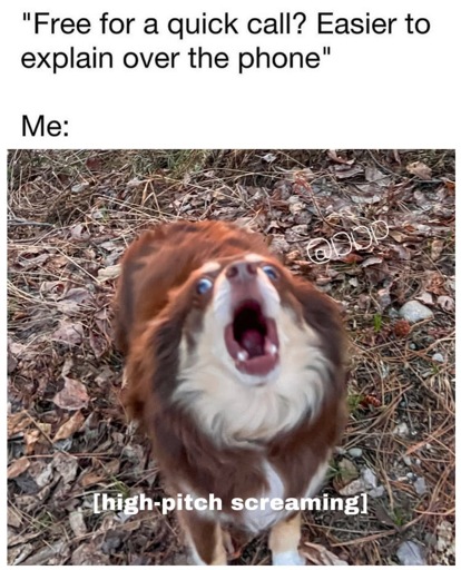 I hate random calls but I’m also usually very time efficient with answering things, so despite my own usual aversion to calls I find work is the only place I’ll ask if I can quick demo/show something to get input. Lasts a total of 3 minutes, keeps me on-topic to my work, and takes less time than waiting for their slow typing back while I’ll be distracted in typical ADHD fashion and start trying to discover if my laptop dock can make my hand cream melt.