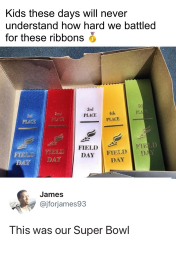 And the second memory was how meaningless the ribbons actually were. I pretty much [laced last or second to last in all of them. so Like someone else here, I got alot of last place ribbons. But after the event everyone was just milling around, and there was the box that held the ribbons. No one was guarding or anything. So I just went up grabbed a handful of No. 1 ribbons and called it a day.
