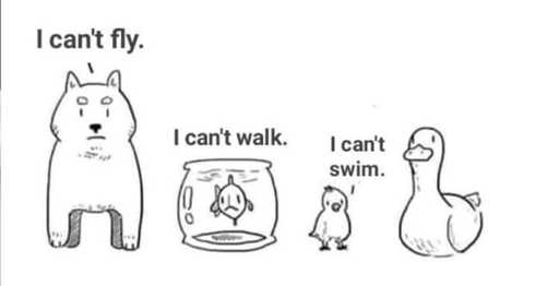 Notice how for each combination of swimming, walking and flying, there is a living creature that can do just that, with the exception of swimming and flying.