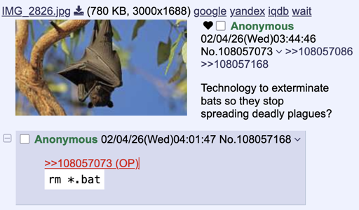 minus-squareZombieChicken@sh.itjust.workslinkfedilinkarrow-up1·1 day agofind / -name “*.bat” -print0 | xargs -0 shred -fuv -n3