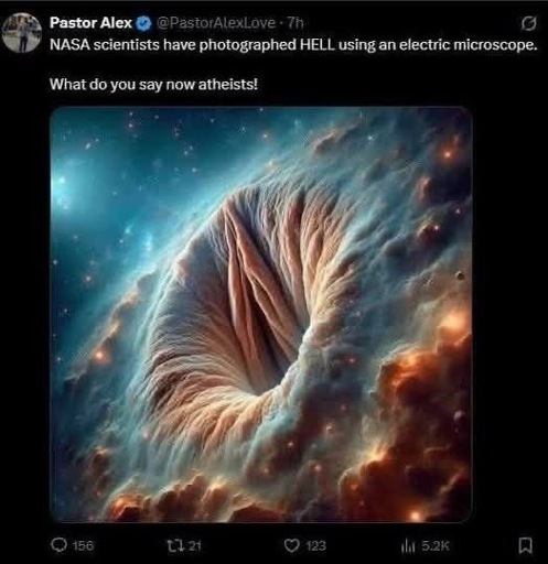 Oh good, another sermon screenshot that got science from a cereal box. No, NASA did not photograph “HELL” with an electric microscope. Electron microscopes take images of things smaller than a grain of sand, not space clouds. Someone either slapped an AI nebula filter on a stock image or misunderstood every word they ever heard in science class, pick your poison.