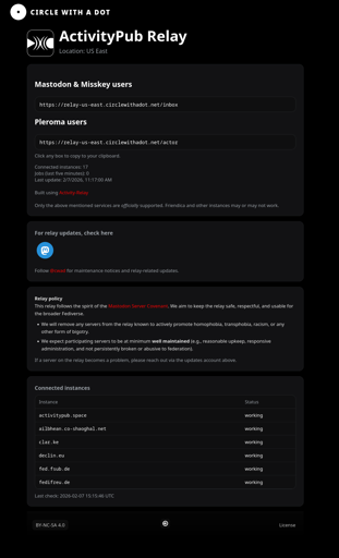 Follow on Mastodon for relay status updates and info: https://mastodon.circlewithadot.net/@cwad