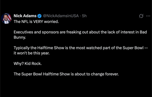 Kid Rock was headlining that show, but it’s separate from Turning Point USA’s halftime show starring Kid Rock. As far as I know, that one is still happening.