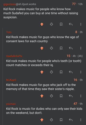 Best one I’ve heard: Kid Rock makes music for people who wipe their face with a McDonalds bag.