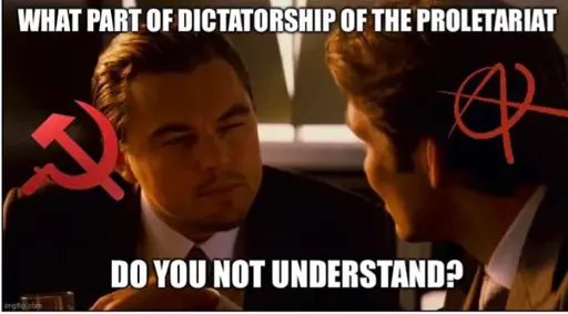 The Communist is asking “what part of dictatorship of the PROLETARIAT do you not understand?” Because they think the society Anarchists want is a form of a dictatorship-of-the-proletariat.