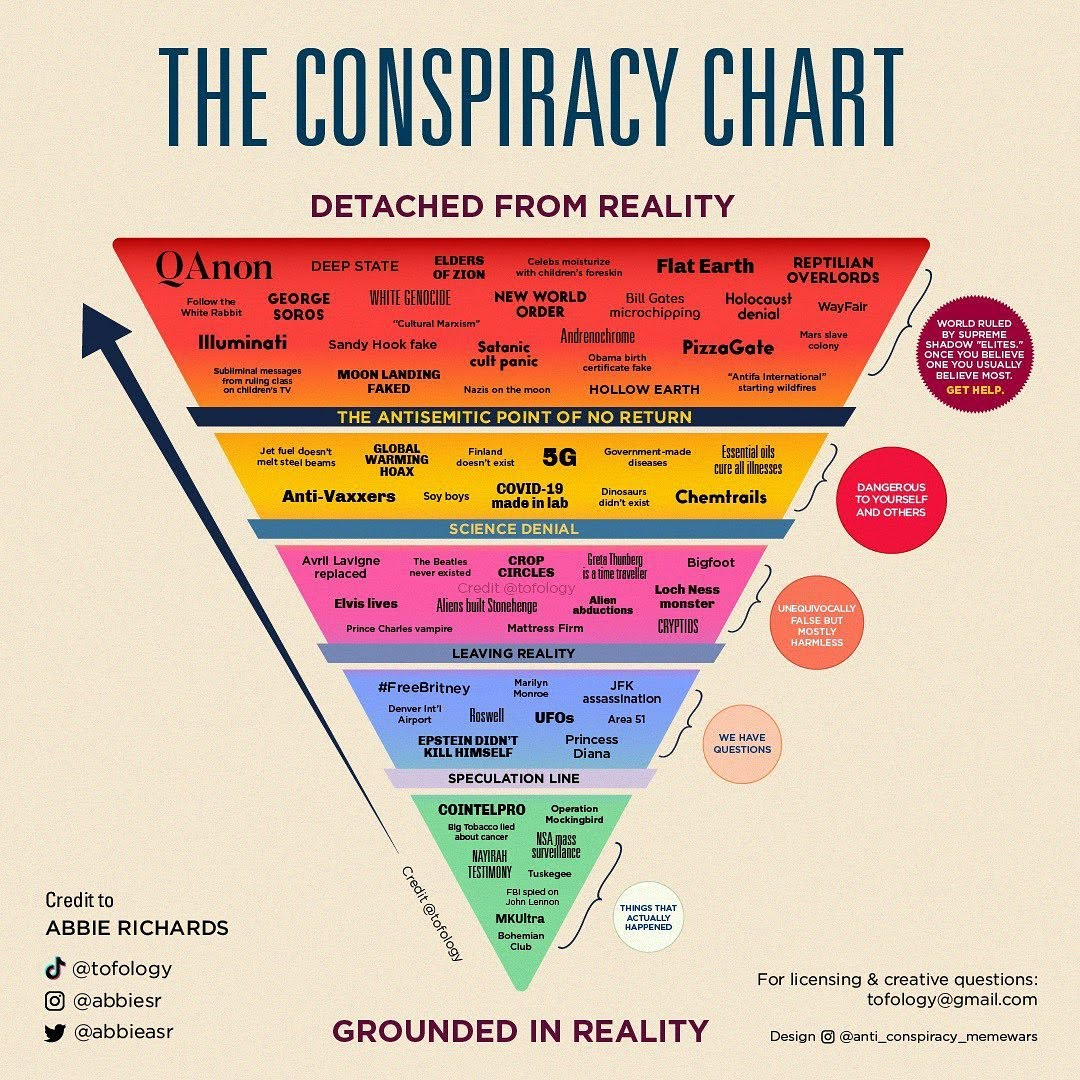 For example, chemtrails is a vintage conspiracy thory, its been around for a while and most people can casually make fun of it. I cant make jokes about half of that top row because most normal people just know what most of those words even mean, let alone the contents of the conspiracy.