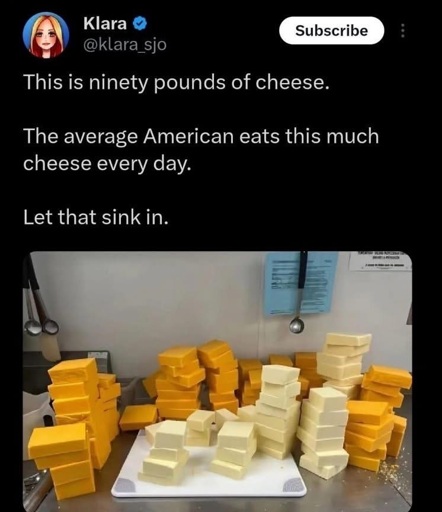 minus-squareNateNate60@lemmy.worldlinkfedilinkarrow-up67·7 days agoThis is false, due to contaminants our air is legally considered dairy in Europe, and thus the average American actually consumes twice this quantity daily