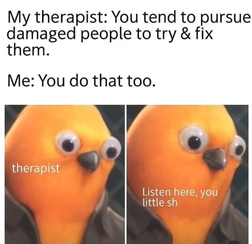 Psychotherapists are conceptually like if your car broke down constantly and every mechanic told you they don’t know what’s wrong so you went to get a degree in mechanical engineering so you can do it yourself. It didn’t help, but you still have the degree now so might as well put it to use and help people with actually solvable problems lol.