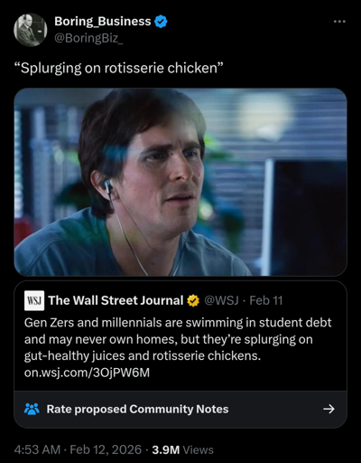 ByteOnBikes@discuss.online to People Twitter@sh.itjust.works · 8 hours agoAvocado toast is out. Rotisserie chicken is in.discuss.onlineimagemessage-square60fedilinkarrow-up1406arrow-down14file-text