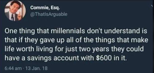 For the literalists out there, the $600 amount is actually irrelevant. The joke is that there would be an amount of money that won’t do anything truly life changing for you.