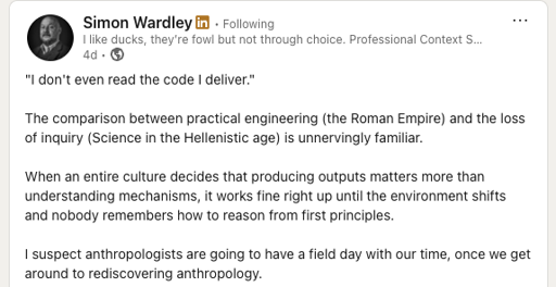 One of the surprising (at least to me) consequences of the fall of Twitter is the rise of LinkedIn as a social media site. I saw some interesting posts I wanted to call attention to: First, Simon W…