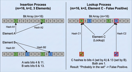 The catch is that different names might end up flipping the same bits by pure coincidence. If you ask the filter if John Doe is there it might see all 1s and say yes even if John never showed up. That is a false positive and you just have to live with it. But if the filter sees even a single 0 it knows for a fact that John is not there. It never lies about a negative which is where the real magic happens for fast searches.